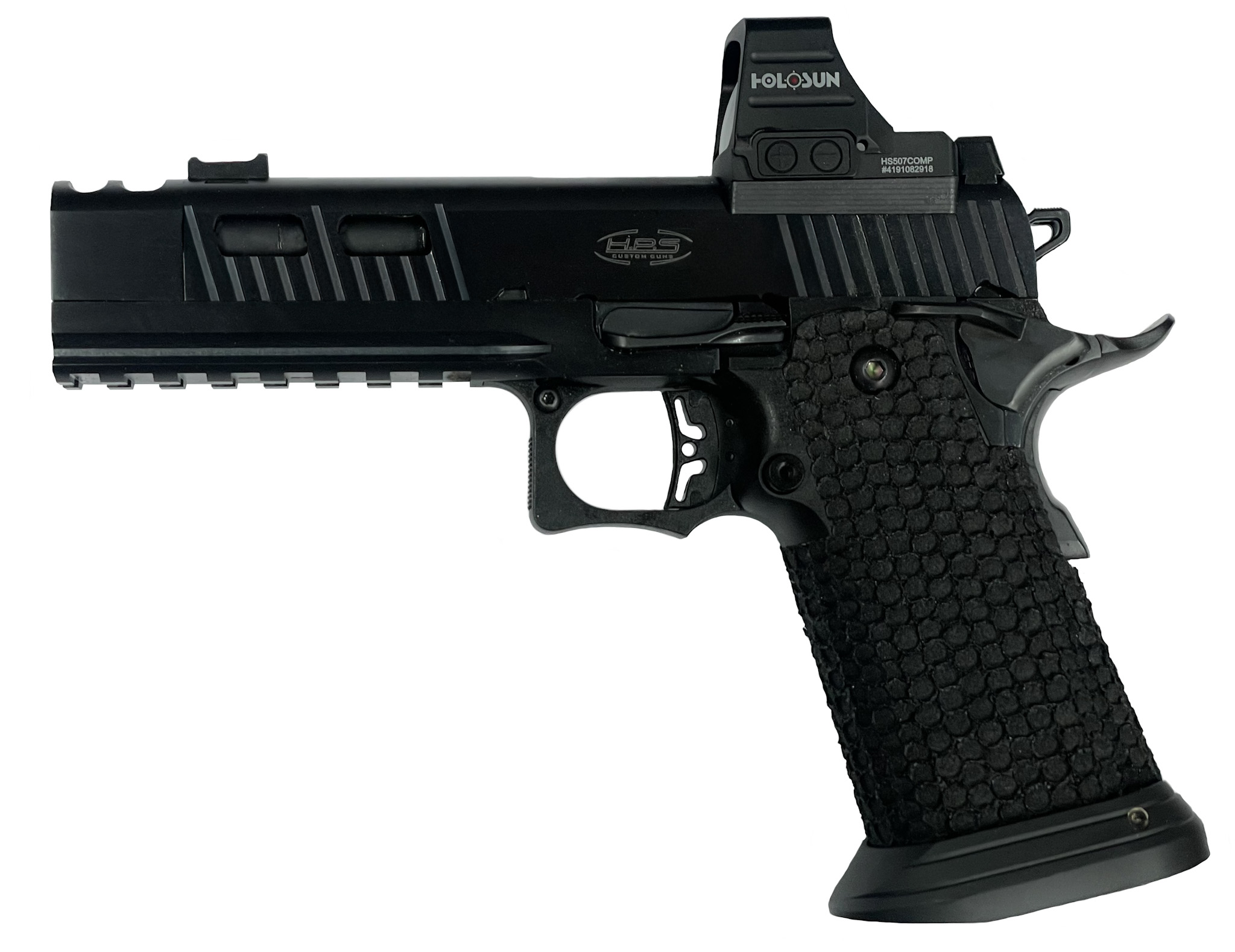 High Capacity Griffstück mit geschmiedeter Schlittenführung und Picatinny Rail * Schlitten mit Griffrillen vorne und hinten * Master-Ausfräsungen vorne * Bullbarrel 4,25“ mit Rampe * 1 Kammer Comp, angepasst an Griffstück-Vorderkante * vergrößertes Auswurffenster * verlängerter Ausstoßer * getunter Auszieher * high grip Beavertail * Commander Match Hammer * Match Sear * lange Federführungsstange * breite beidseitige Sicherung * Abzugtuning * Titan-Aluminium nitriert * inklusive Magazintrichter * Festes Visier * Adapterplatte für RedDot mit RMR footprint tief eingesetzt * Waffe komplett aus übermaßigen Teilen von Hand gepasst, dadurch wird beste Präzision und höchste Genauigkeit erreicht